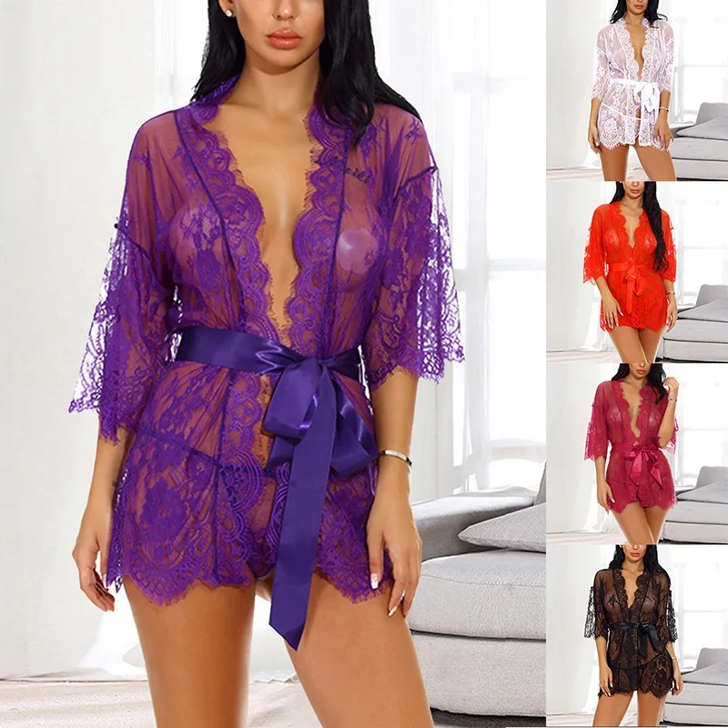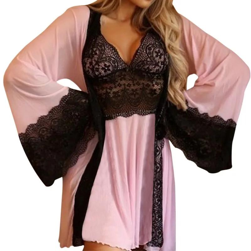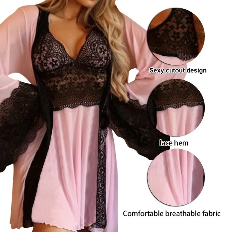 Пикантная Женская кружевная комбинированная Пижама, модный кардиган из трех предметов, пальто с расклешенными рукавами, платье на бретелях с V-образным вырезом и открытой спиной