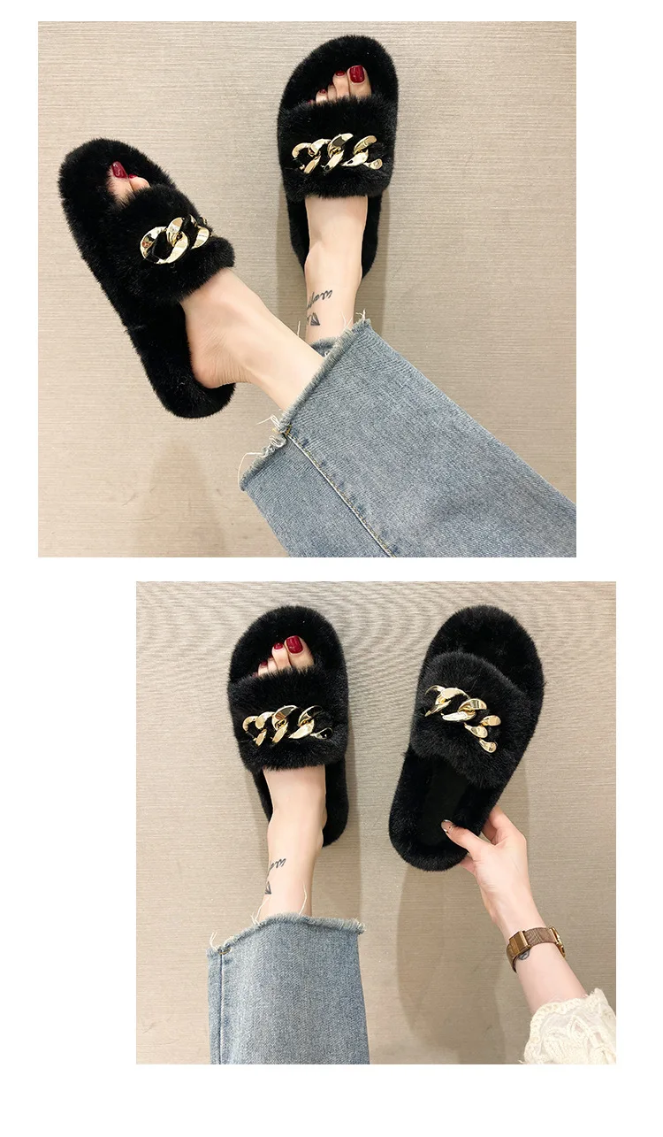 Стиль: брендовые Роскошные зимние женские меховые тапочки с металлической цепочкой
