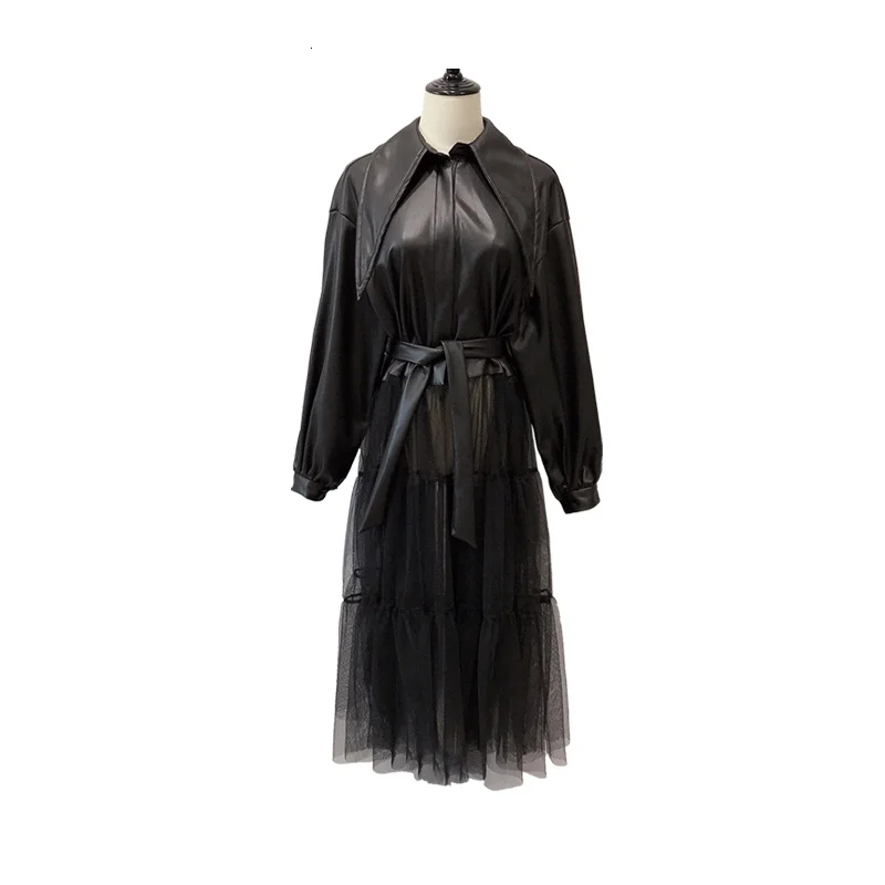 LANMREM 2022 Осенние новые куртки женские модные однотонные длинные сетчатые пальто из искусственной кожи с поясом женские PB279