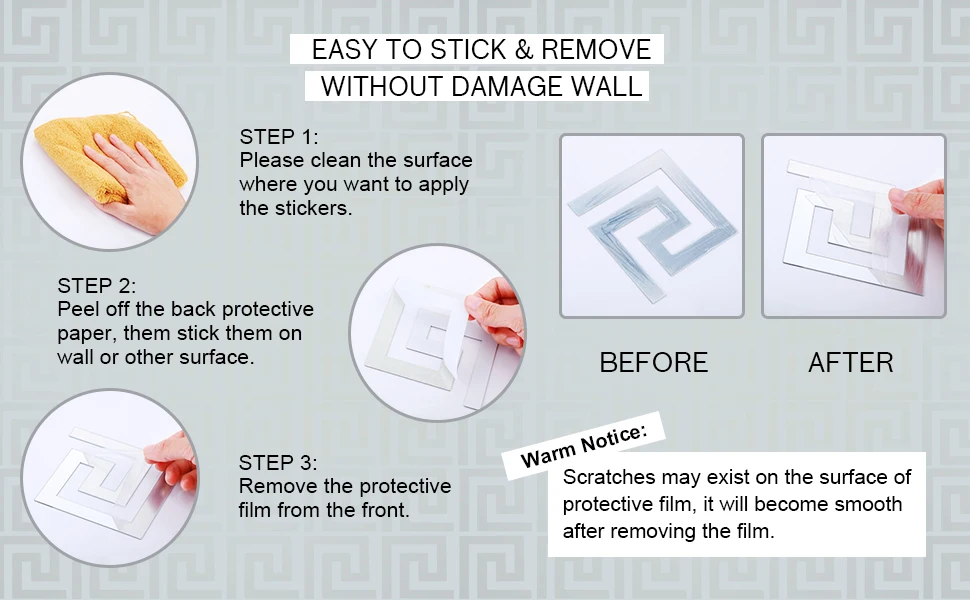 Примечание: Зеркальная Наклейка-это трехмерная Наклейка на стену. Материал зеркала не может быть сложен или свернут. Он боится царапин и царапин. Пожалуйста, не забудьте снять защитную пленку после того, как она наклеена