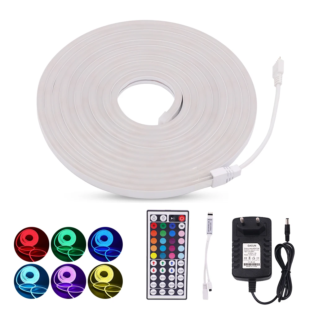 Новое прибытие высокая яркость неоновый светильник подходит для внутреннего/наружного украшения.Хороший светильник эффект и нет темных участков, 12V низшее напряжение светильник полосы, на ощупь, высокий индекс цветопередачи, антибликовый, легкая установка,Неоновый набор RGB с 44-клавишным ИК-пультом, вы можете изменить цвет, яркость и т. д.
