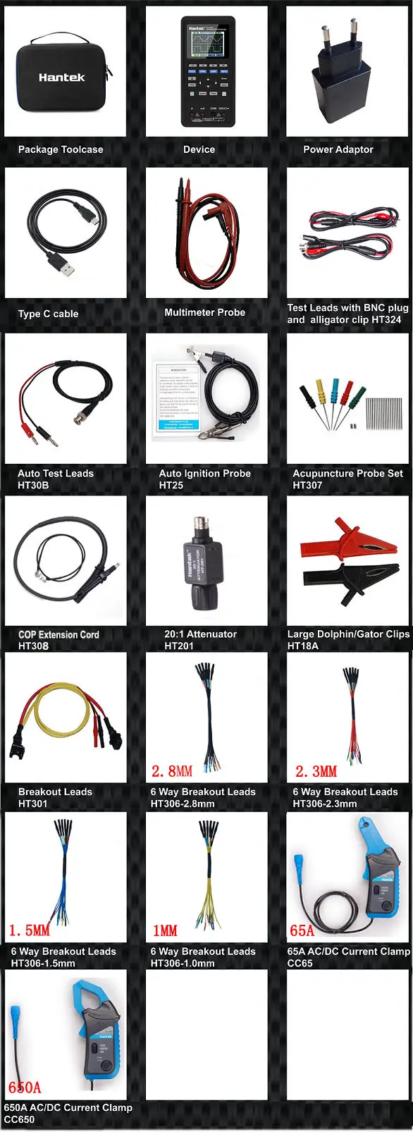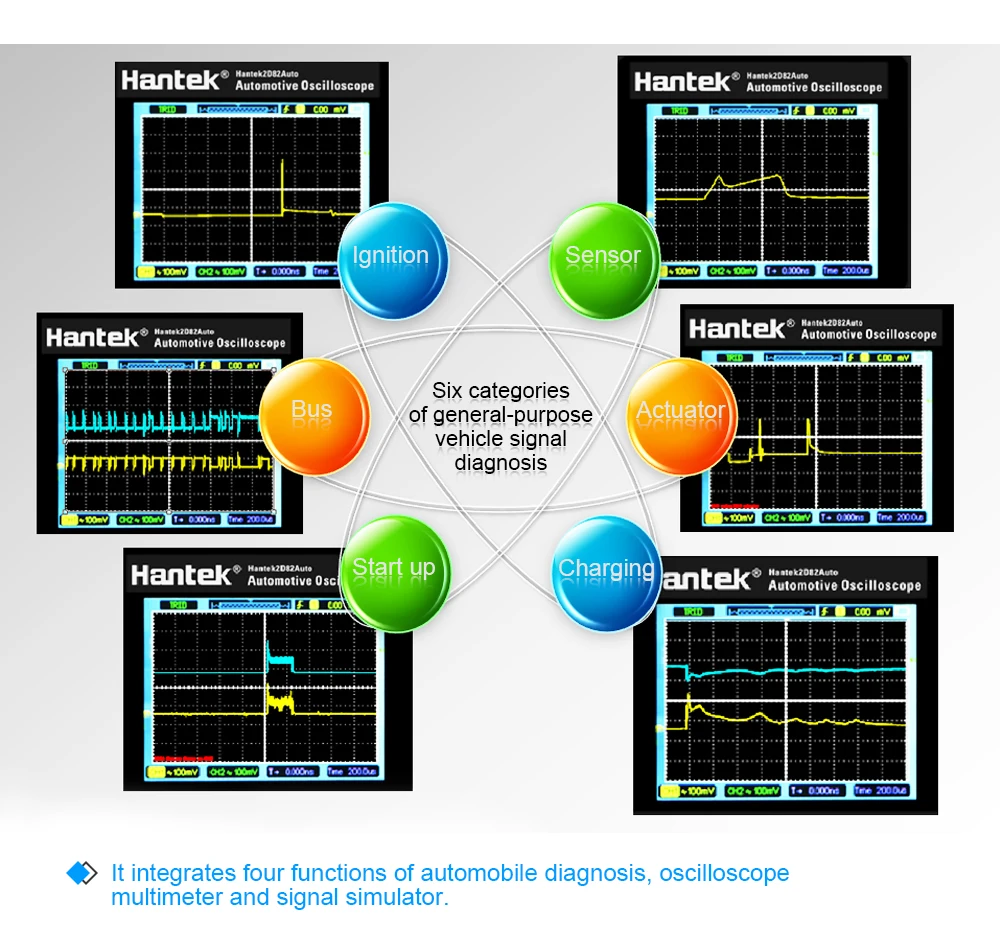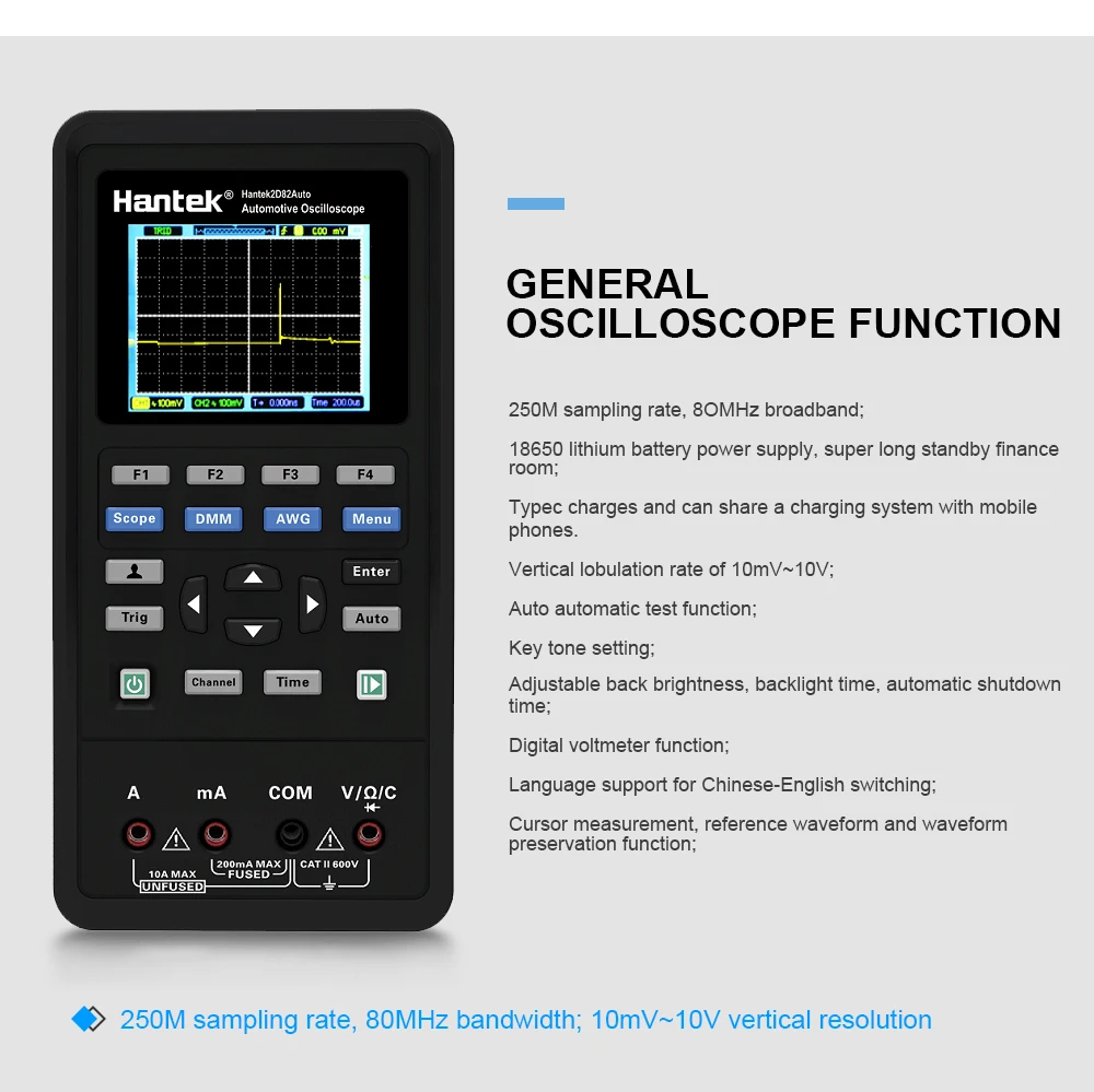Совершенно новая портативная серия oscilloscope-Hantek2000, она продолжает компактную и легкую концепцию, но с многофункциональным тестером 4 в 1 нового поколения: Автомобильная диагностика, осциллограф, источник сигнала и мультиметр; небольшой объем некоммерческого захвата одной рукой; Подвесная подставка была разработана для поддержки регулировки нескольких углов; Ultra-low.power, Интерфейс зарядки типа C, каждый 2 часа заряда батареи позволяет работать один полный день или в режиме ожидания два месяца; Цветной ЖК-дисплей высокой четкости четкий и деликатный; Минималистичный дизайн клавиатуры упрощает работу, прост в использовании.С более чем 80 видами тестирования автомобиля и сканирование qr-кода на задней части устройства может открыть видео файлы помощи, чтобы показать вам, как тестировать транспортные средства.· Первые тестовые проекты: вакуумная степень впускного коллектора и зажигание, регулировочный клапан lampblack-степень вакуума и зажигание, зажигание выхлопа (холостого хода), зажигание выхлопа (запуск).· Запуск и зарядка: цепь зарядки, ток и напряжение.· Привод: бензин/дизель.· Обнаружение автобуса: наблюдение за данными CAN Bus, целостность сигнала CAN bus, долгосрочное приобретение CAN bus LH, Lin-bus.· Датчик s: расходомер воздуха, распределительный вал, коленчатый вал, распределитель, датчик лямбда, положение дроссельной заслонки.· Зажигание: Первичное/вторичное.· Осциллограф: 2 канала осциллографа, 80 МГц полоса пропускания, 250 м частота дискретизации.· Функция мультиметра: напряжение, ток, сопротивление, диод, конденсатор, испытание ВКЛ-ВЫКЛ;· Функция вывода генератора сигналов: синусоидальный, квадратный, треугольный, трапециевидный и другие формы волны; Синус до 25 МГц;