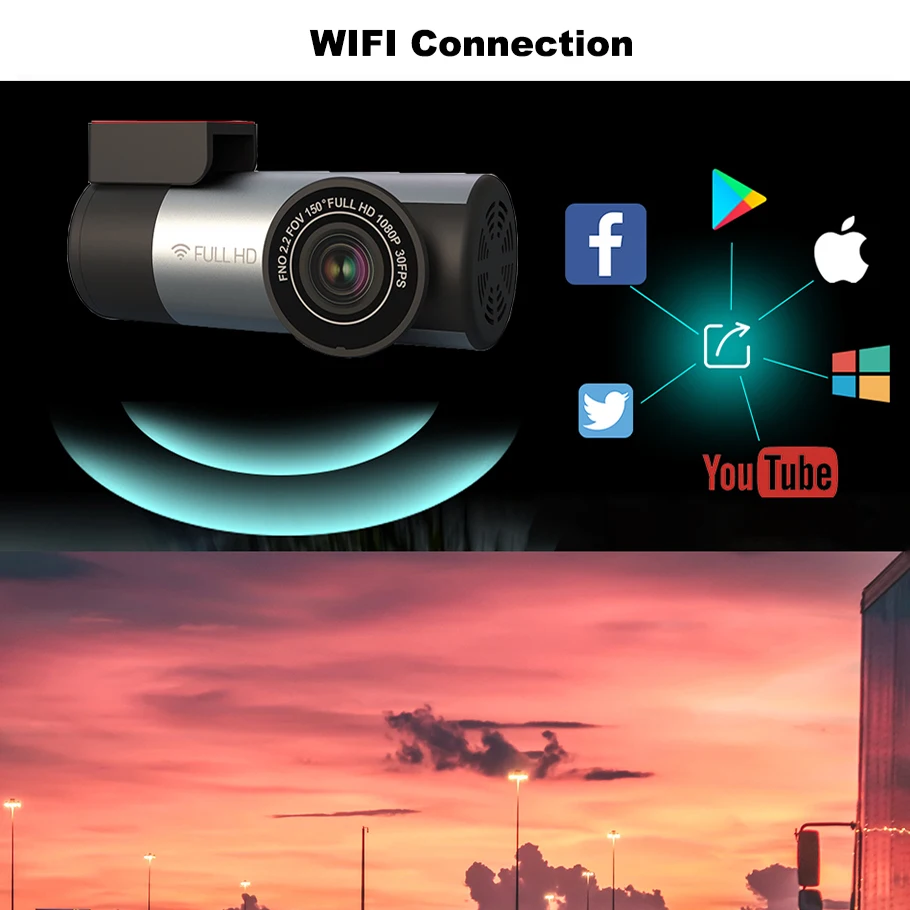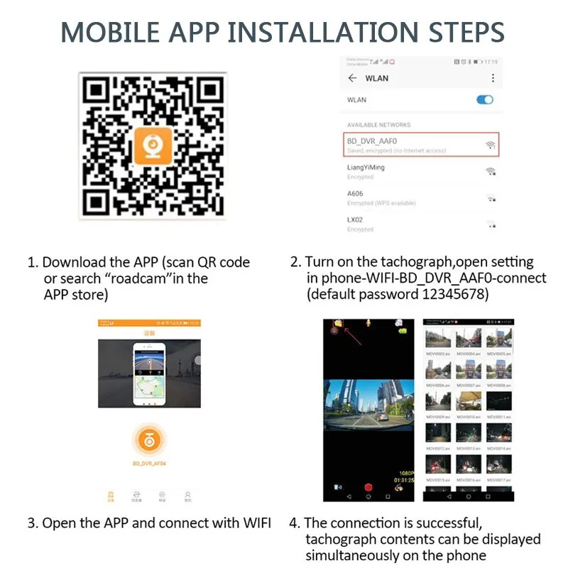 Простое подключение Wi-Fi, просто отсканируйте qr-код в руководстве, чтобы загрузить приложение Roadcam, а затем подключите к wifi с именем BD-DVR, вы можете просматривать и управлять видеорегистратором на своем телефоне