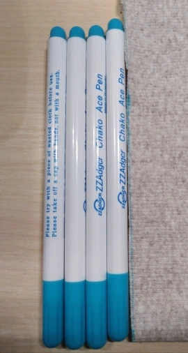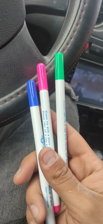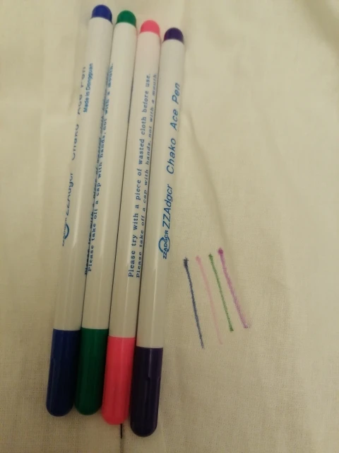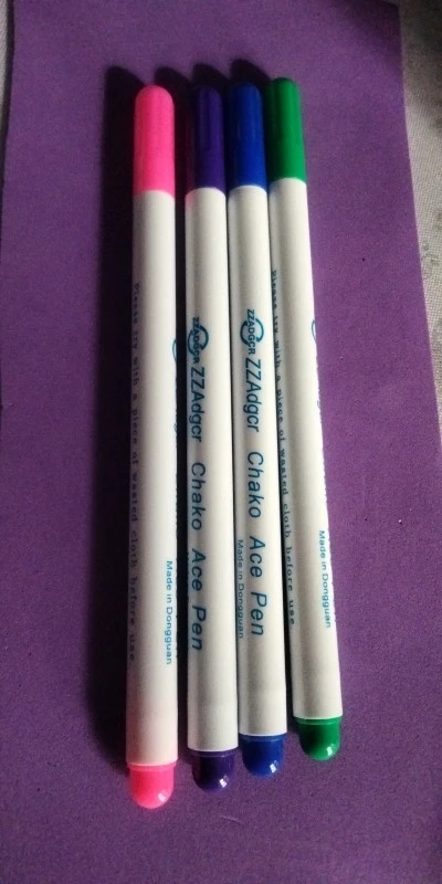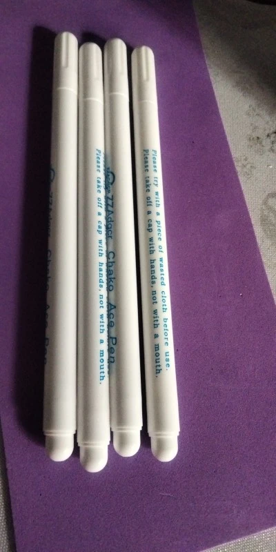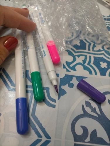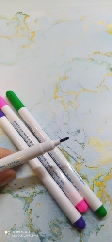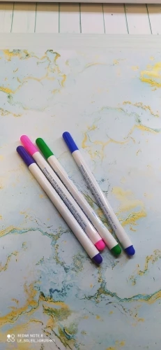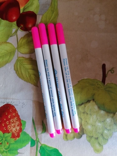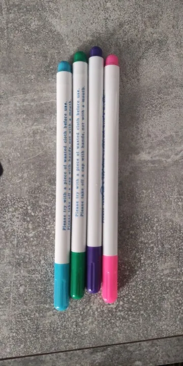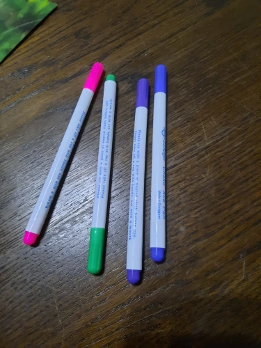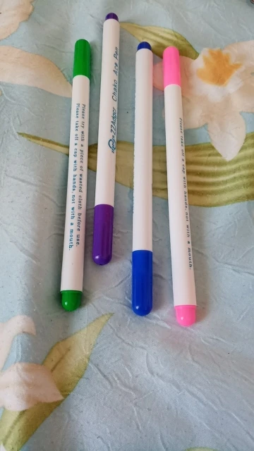 Прекрасные маркеры по ткани, все четыре пишут хорошо, особенно яркие фиолетовый и голубой. Стержень тонкий и длинный, что удобно. Они правда исчезают сами через некоторое время, даже не очень большое. То есть прямо как тают на глазах. А если на них подышать, то ещё быстрее исчезают. Товар хороший! Шли очень долго.