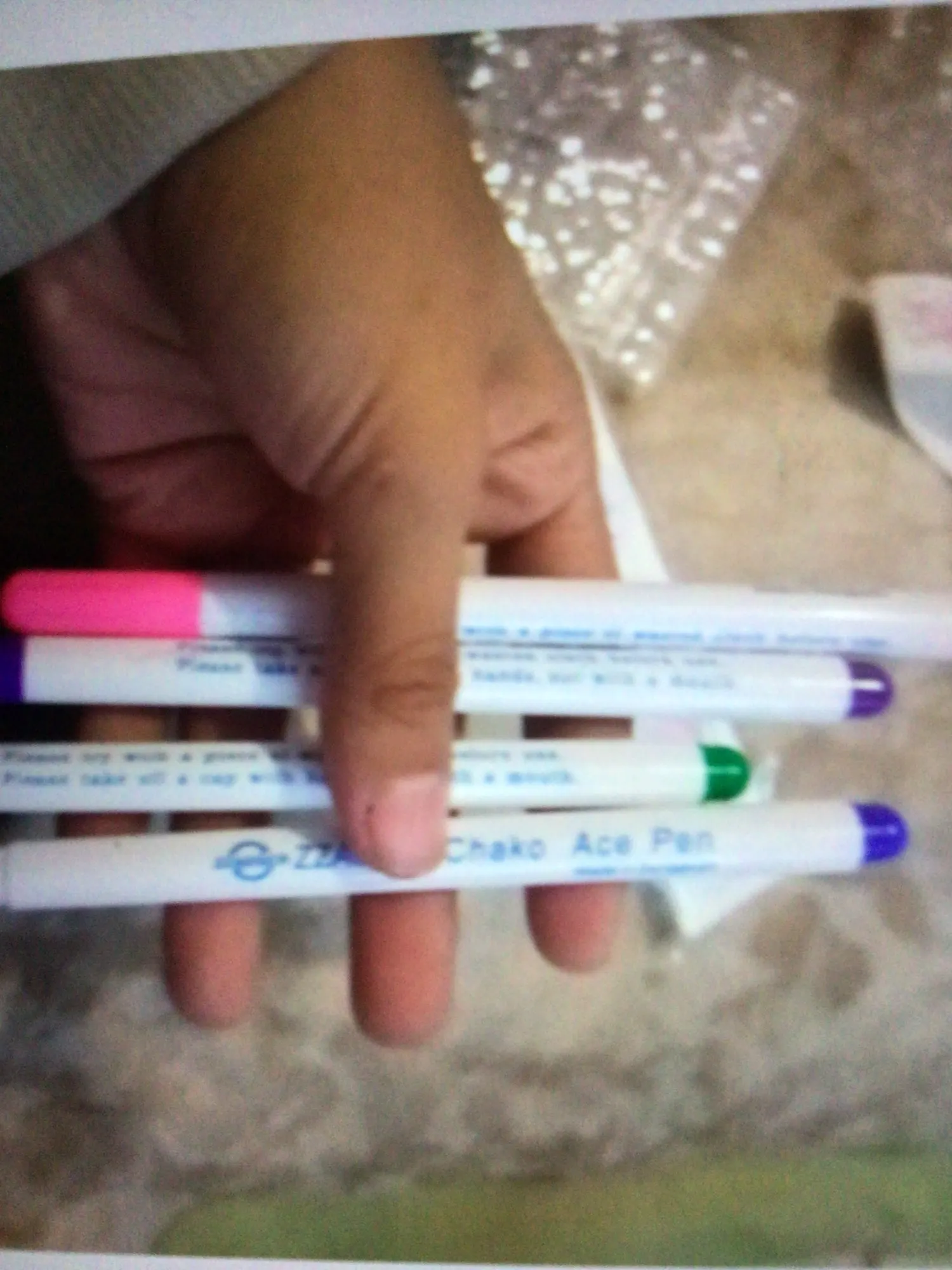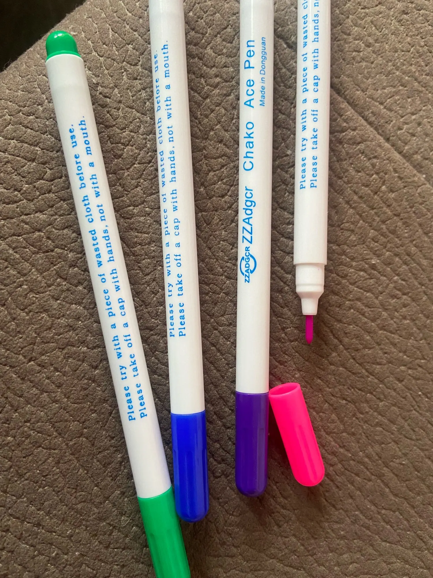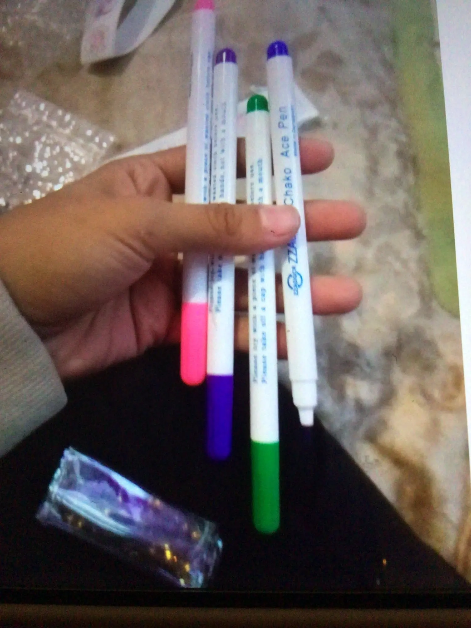 Прекрасные маркеры по ткани, все четыре пишут хорошо, особенно яркие фиолетовый и голубой. Стержень тонкий и длинный, что удобно. Они правда исчезают сами через некоторое время, даже не очень большое. То есть прямо как тают на глазах. А если на них подышать, то ещё быстрее исчезают. Товар хороший! Шли очень долго.