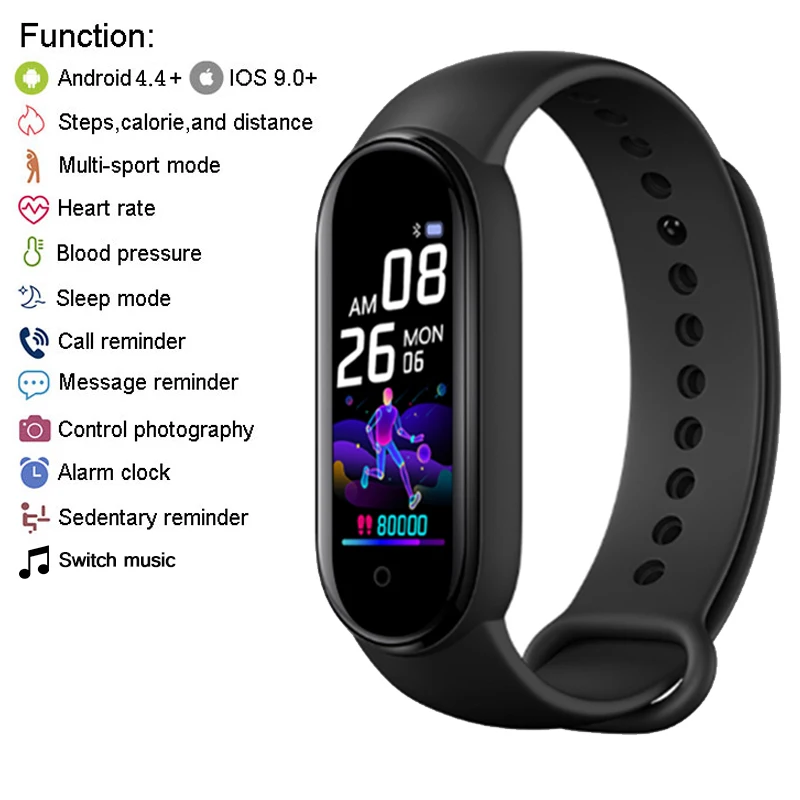 Тип: умный Браслет M5Материал: ТПУ, АБС, ПКПриложение: Fitpro (язык приложения не является обязательным)Системные требования: для Android 4,4/IOS 9,0 или выше* Цветной экран 0,96 дюйма, одноточечная сенсорная кнопка, четкая видимость даже под солнечным светом.* Пыленепроницаемый и водонепроницаемый IP65,