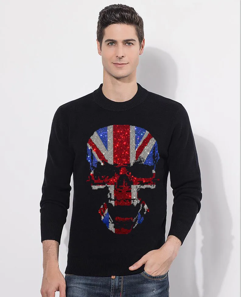 Мужские свитера, новинка, Модный зимний свитер с круглым вырезом и черепом, Мужской пуловер с длинным рукавом, повседневный мужской свитер с камнями, модная ткань