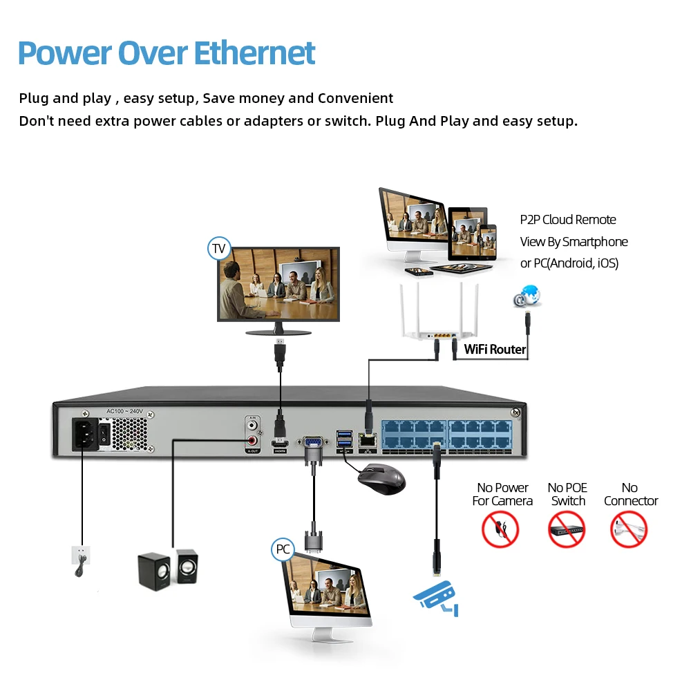 Нет дополнительных кабелей питания или адаптеров, просто подключив ip-камеру к NVR с помощью одного кабеля, вы можете легко завершить установку без знания о компьютере или сети и начать наслаждаться супер простым мониторингом среди вашего смартфона, планшета или ПК.
