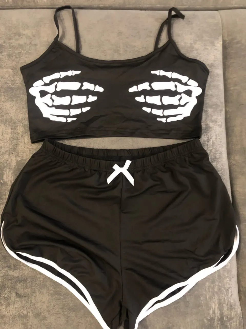 Пижамный комплект с принтом скелета, Женская Хлопковая пижама на бретельках без рукавов, женская летняя Ночная одежда, домашний костюм