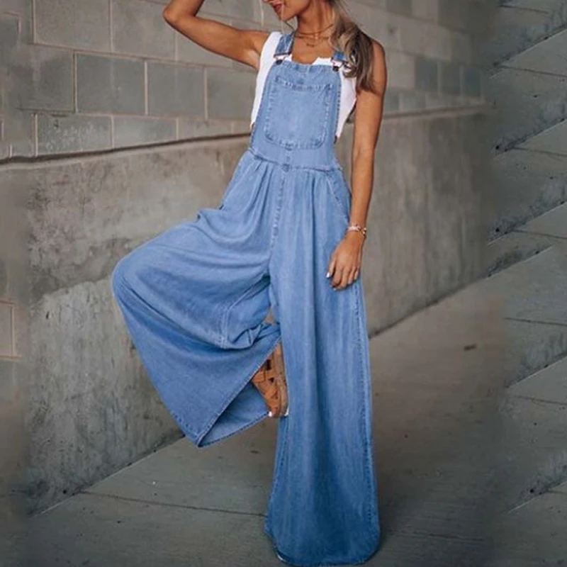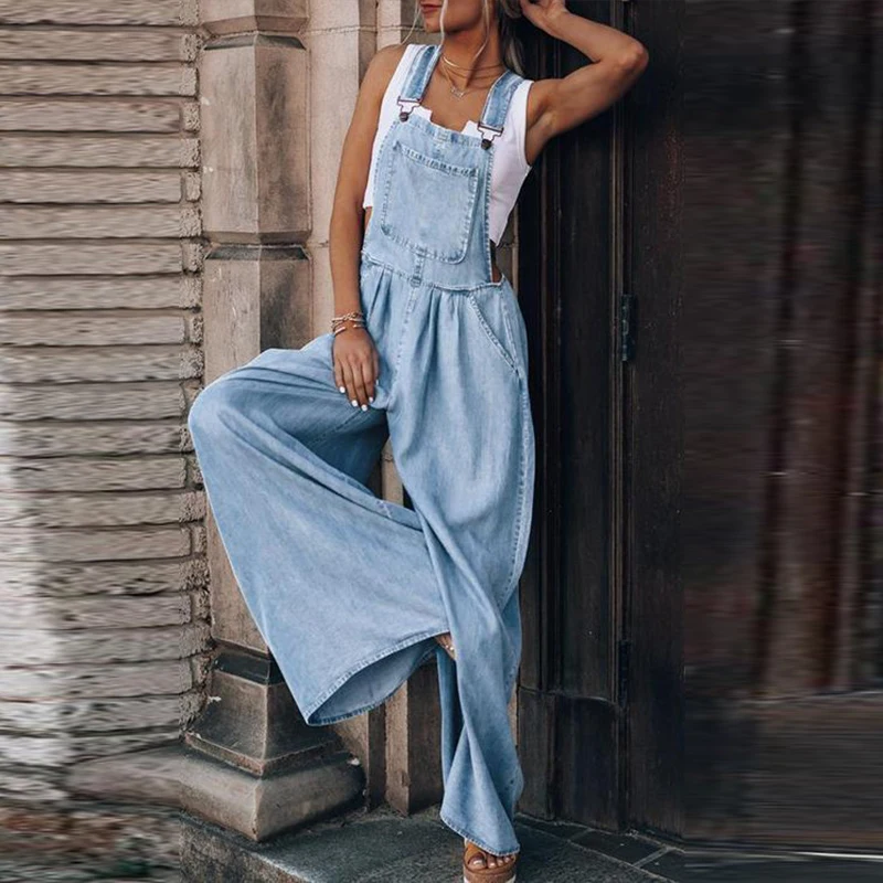 Женский джинсовый комбинезон с карманами, элегантный однотонный комбинезон со средней талией и широкими штанинами, повседневный комбинезон в ковбойском стиле, весна-лето