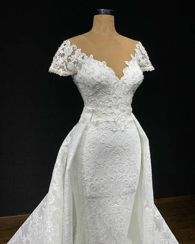Роскошное кружевное женское платье со съемным шлейфом 2021 с драгоценным вырезом русалка платье принцессы для невесты