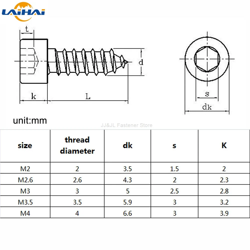 Самонарезающие винты M2 M2.6 M3 M3.5 M4 304 A2-70 из нержавеющей стали с шестигранной головкой под шестигранник, для мебели, дерева, 1050 шт.