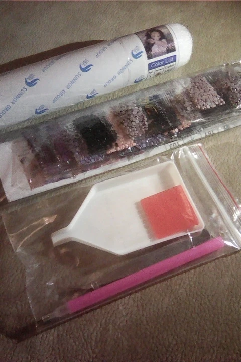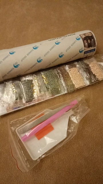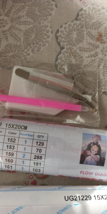 Алмазная мозаика размером 15 на 20 см. Рисунок из какого-то мультфильма, но мне не знакомого. Стразы круглого размера. Очень понравилось, что картинка была намотана на валик, значит будет без заломов. Посылку доставили за три недели вместе с другими товарами.
