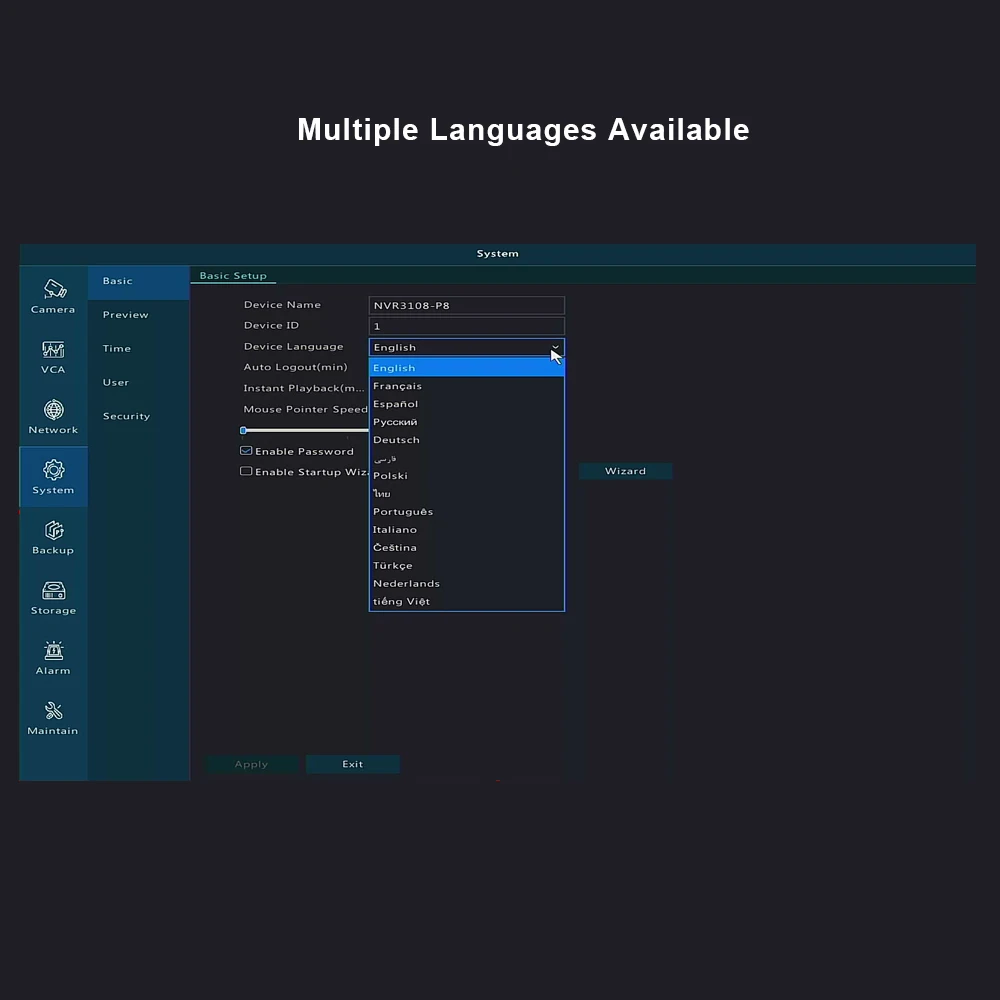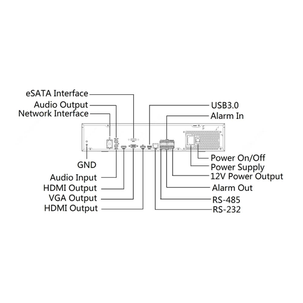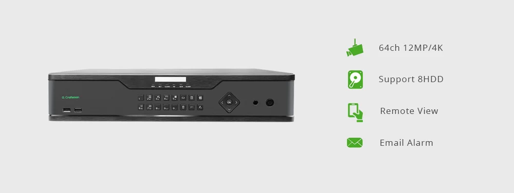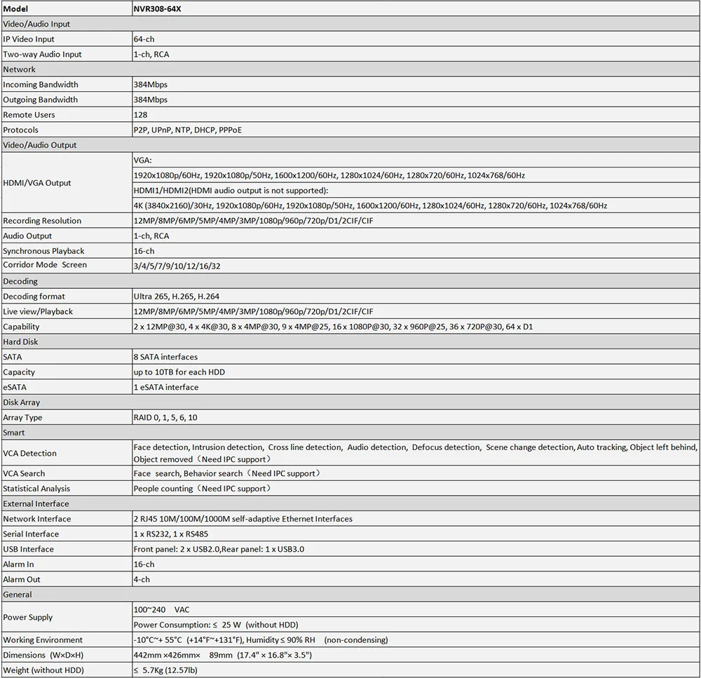 -Поддержка форматов видео Ultra H.265/H.265/H.264-Вход 16/32/64 каналов-Вечерние ip-камеры с поддержкой ONVIF Соответствие: профиль S, профиль G, профиль T-Поддержка 2-ch HDMI, 1-ch VGA. Разрешение HDMI1 и HDMI2 до 4K (3840x2160)-HDMI1, HDMI2, доступны независимые выходы VGA-Запись разрешения до 12 мегапикселей-Поддержка RAID 0, 1, 5, 6, 10-8 SATA HDDs, до 10 ТБ для каждого жесткого диска-Различные режимы деформации рыбий глаз для просмотра в реальном времени и воспроизведения для веб-интерфейса и графического интерфейса-Поддержка N + 1 горячий запасной-Поддержка 12 в выходной мощности-Технология ANR для повышения надежности хранения при отключении сетиПоддержка обновления облака