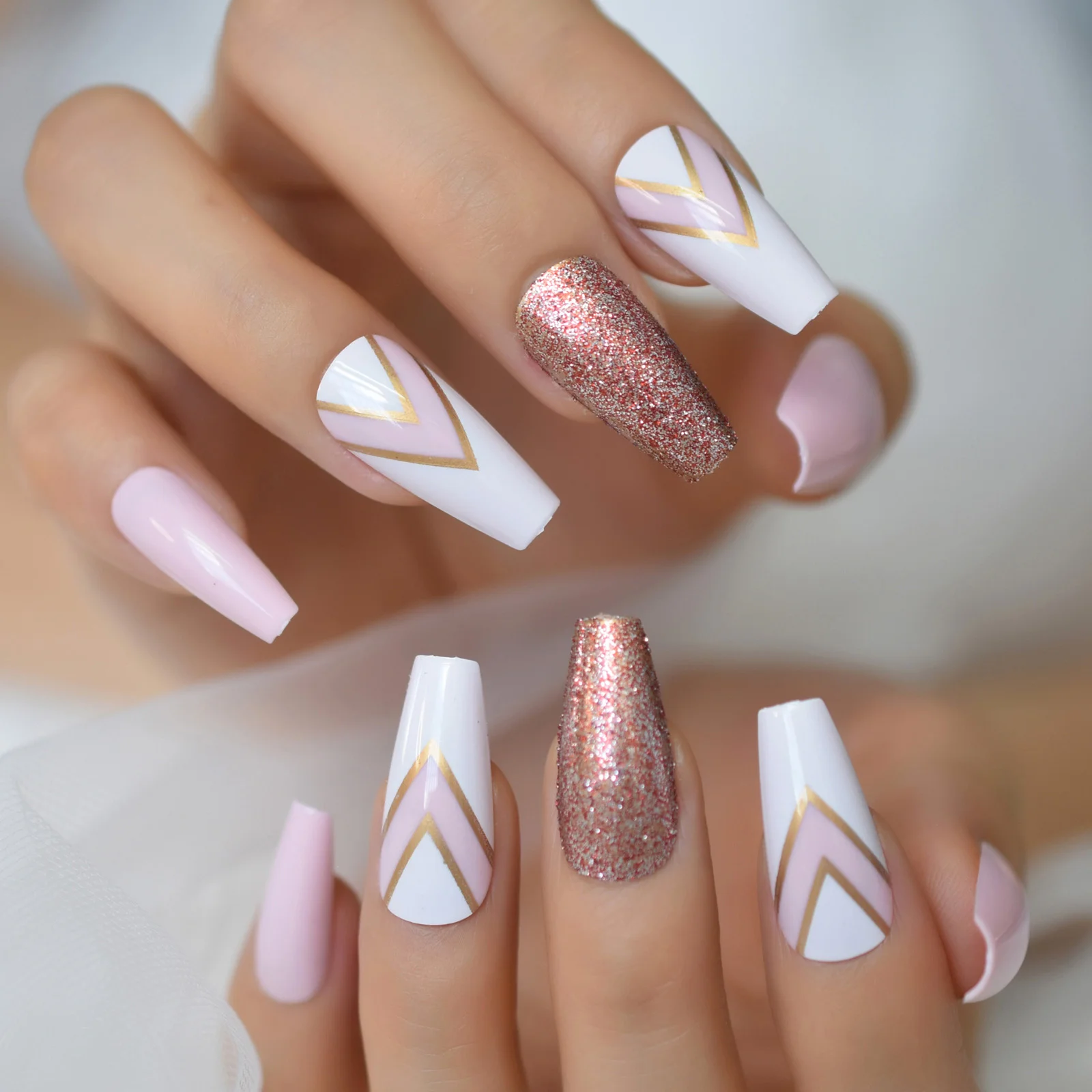 Сверкающие блестящие накладные ногти французский пресс V Line розовый белый длинный гроб балерины полное покрытие Искусственные ногти инструмент для удлинения