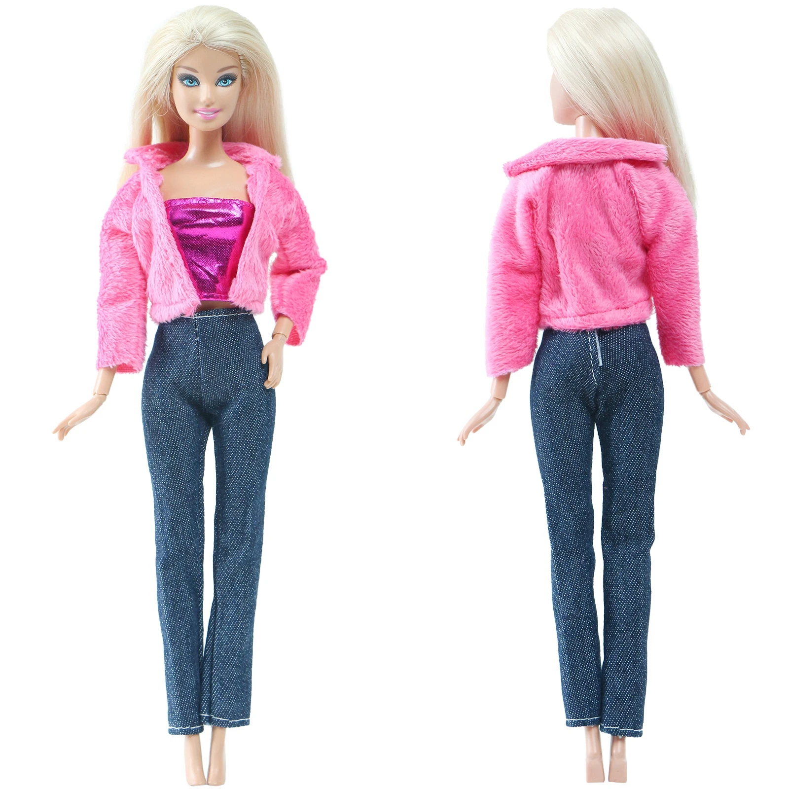 BJDBUS современные джинсовые брюки розовый жилет меховое пальто повседневный наряд Аксессуары Одежда для куклы Барби игрушка для девочки подарок на день рождения