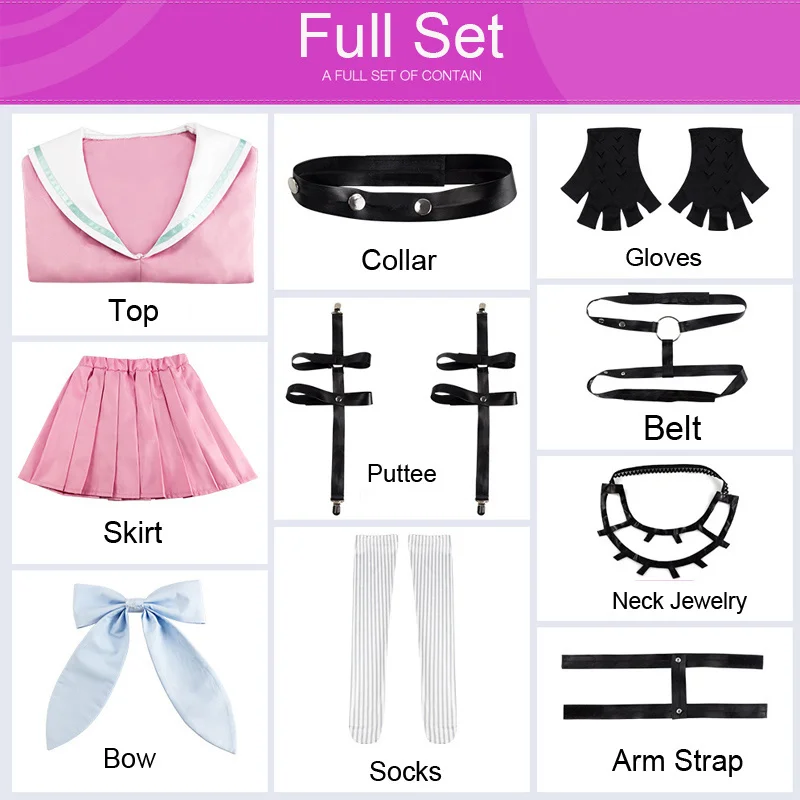 Аниме-игра: Danganronpa V3: Killing HarmonyПерсонаж: Miu IrumaВ комплект одежды входит: топ + юбка + бант + воротник + украшение на шею + ремешок на руку + ремень + перчатки + леггинсы + носки.