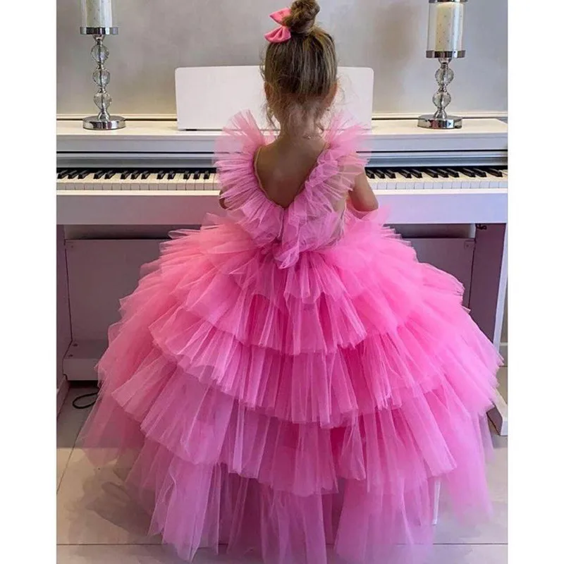 Красочные ярко-розовые платья из тюля с цветочным принтом для девочек, платье для первого мероприятия, платье для девочек на свадьбу, Новый Год Вечерние чные платья с оборками