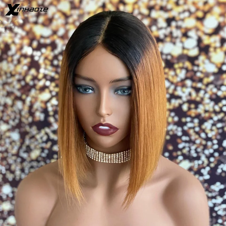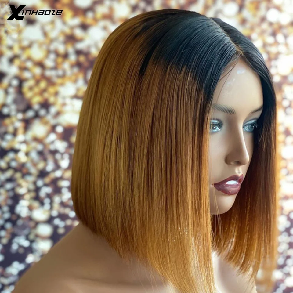 Эффектом деграде (переход от темного к блондин человеческие волосы парики прямые короткие Боб 1B/27 часть синтетические волосы парики шнурка 5x5 ПУ человеческих волос из шелка, Синтетические волосы на кружеве парик с детскими волосами