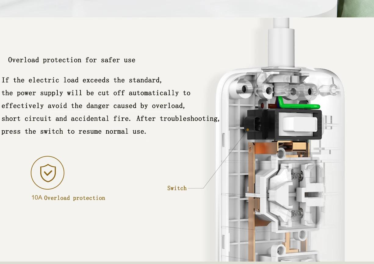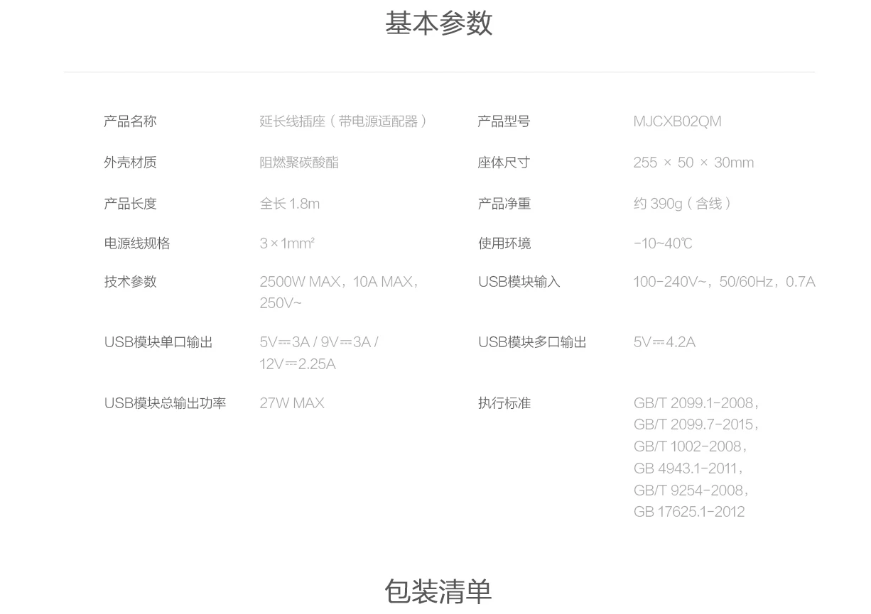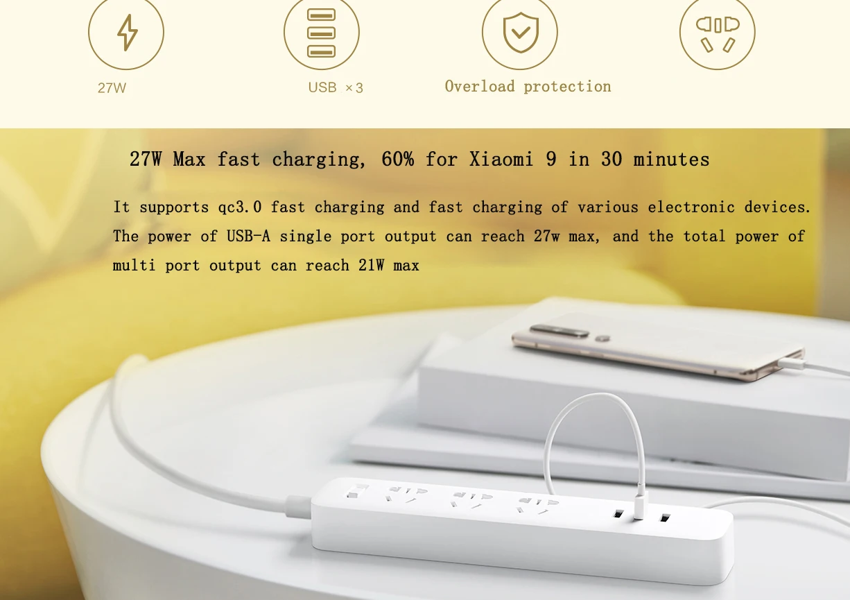 Удлинитель Xiaomi Mijia QC3.0, 27 Вт, 3 USB + 3 розетки, 1,8 м