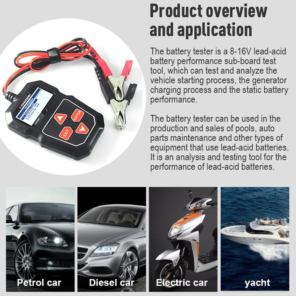 -Он имеет широкий спектр применения и подходит для определения состояния аккумулятора в автомобилях 12 В. Вы можете спокойно использовать его.