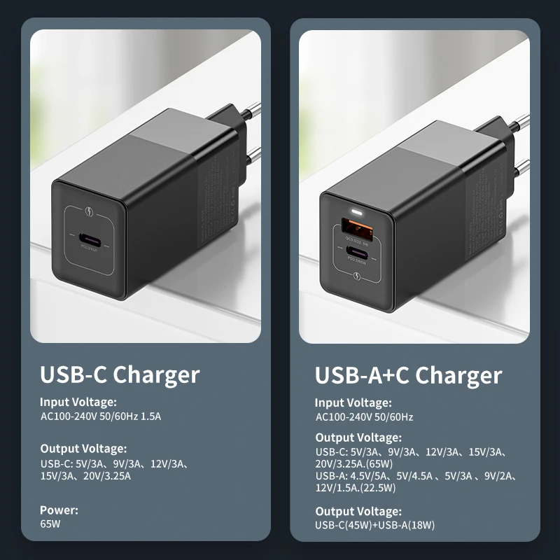 USB-A + C Зарядное устройство Вход Напряжение: AC100-240V 50/60Hz Выходное напряжение Напряжение: USB-C 5V3A/9V3A/12V3A/15В/3A/20V3.25A(65 Вт) USB-A 3,6-6,5 V/3A, 6,5-9 В/2A, 12 В/1.5A(20 Вт) двойной порт Выход: USB-C(45 Вт) + USB-A(20 Вт)
