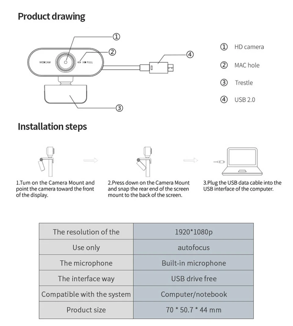Автофокус, чистый выход.Выход Full HD 1080P с очень высоким цветовым дисплеем.Встроенный звукопоглощающий микрофон, ваш голос может быть четко услышан в десяти метрах.Большая текстура без деформации, горизонтальный угол может достигать 100, левый и правый 360 градусов и вверх и вниз 45 градусов ровный, вы можете угол, если хотите.Встроенный микрофон, расстояние захвата может достигать 3-5 метров; Usb-драйвер-бесплатно, подключи и работай, высокая совместимость;Подходит для видеоконференций, веб-трансляций, видеозвонков и т. Д.