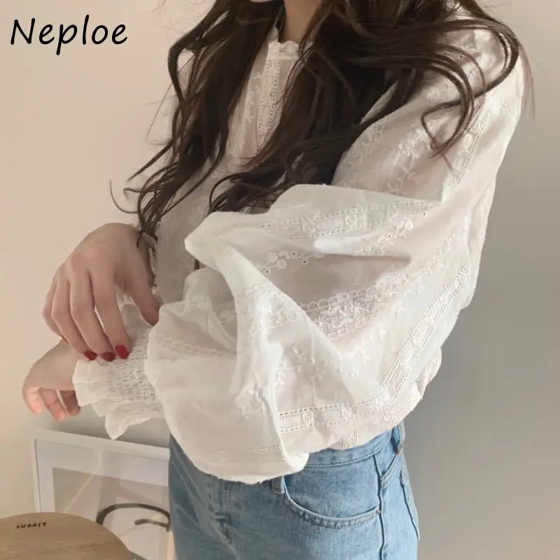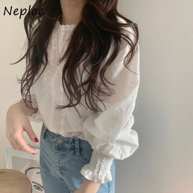 Рубашка Neploe Sweet Sytle со снижением возраста, новинка 2022, осенняя блузка с вязаным крючком кружевом и рукавами-фонариками, однотонные Женские топы с круглым вырезом