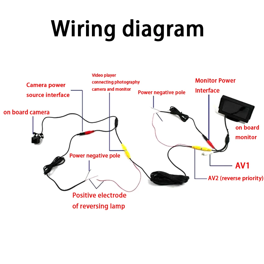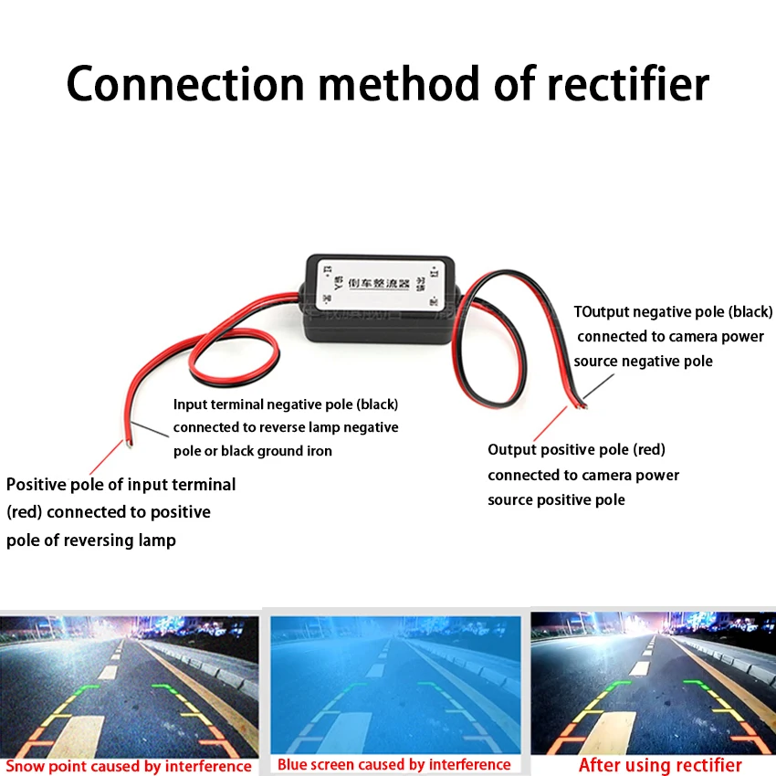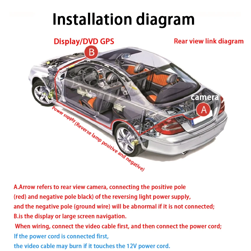 A. Стрелка относится к камере заднего вида, подключая положительный полюс(Красный) и черный отрицательный полюс) Реверсивный светильник питания,И отрицательный полюс (заземляющий провод) будет ненормальным, если он не подключен;B. Это дисплей или большая экранная навигация.При проводке сначала Подключите видео кабель, а затем подключите шнур питания;Если сначала подключен шнур питания,Видеокабель может гореть, если он касается шнура питания 12 В.