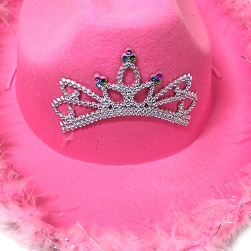 Шляпа Cowgirl в розовом цвете с перьями, сделано из шерсти, фетровая Федора, тиара, декоративная шляпа с блестящими блестками, отличный подарок