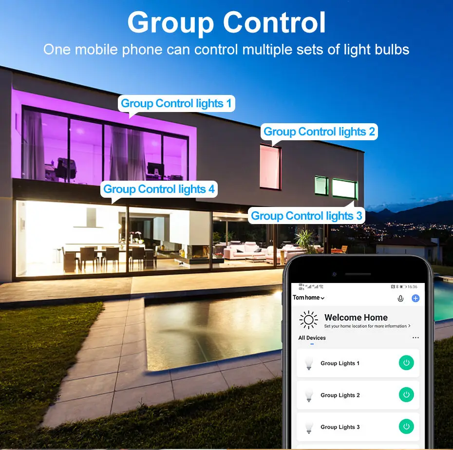 Включение/выключение Siri ,Alexa, google home включило умную лампу, независимо от того, находитесь ли вы дома или далеко. Вам просто нужно загрузить приложение «Умная жизнь». Вы можете создать группу для всех ваших умных ламп и управлять ими с помощью только одной команды.