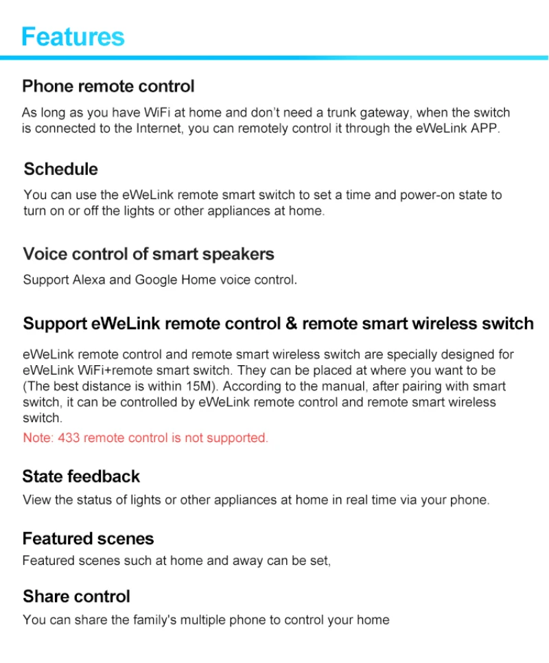 Поддержка дистанционного управления eWeLink и дистанционного беспроводного смарт-переключателя eWeLink, пульт дистанционного управления и удаленный умный беспроводной переключатель специально разработаны для eWeLink WiFi + удаленный умный переключатель. Они могут быть расположены там, где вы хотите быть (лучшее расстояние составляет 15 м). В соответствии с руководством, После сопряжения с смарт-переключателем, его можно управлять с помощью пульта дистанционного управления eWeLink и удаленного интеллектуального беспроводного переключателя.