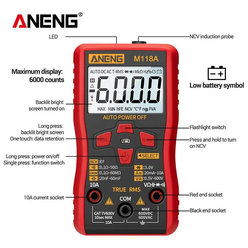 Цифровой мини-мультиметр ANENG M118A, тестер переменного тока 600 в, авто, реальное среднеквадратичное значение, фонарик с функцией хранения данных NCV 6000 отсчетов