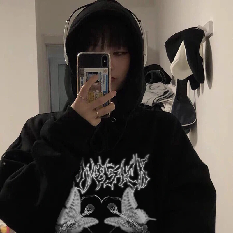 Художественный Женский пуловер с рисунком скелета бабочки, Женский Повседневный Свободный свитшот с капюшоном
