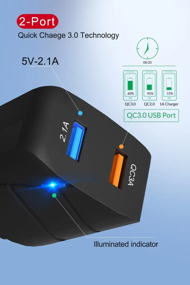 Входное напряжение: AC 100-240V 50/60Hz 0.5A Выход U1 5V-2.1A U2 QC3.0 5V-3A 9V-2A
