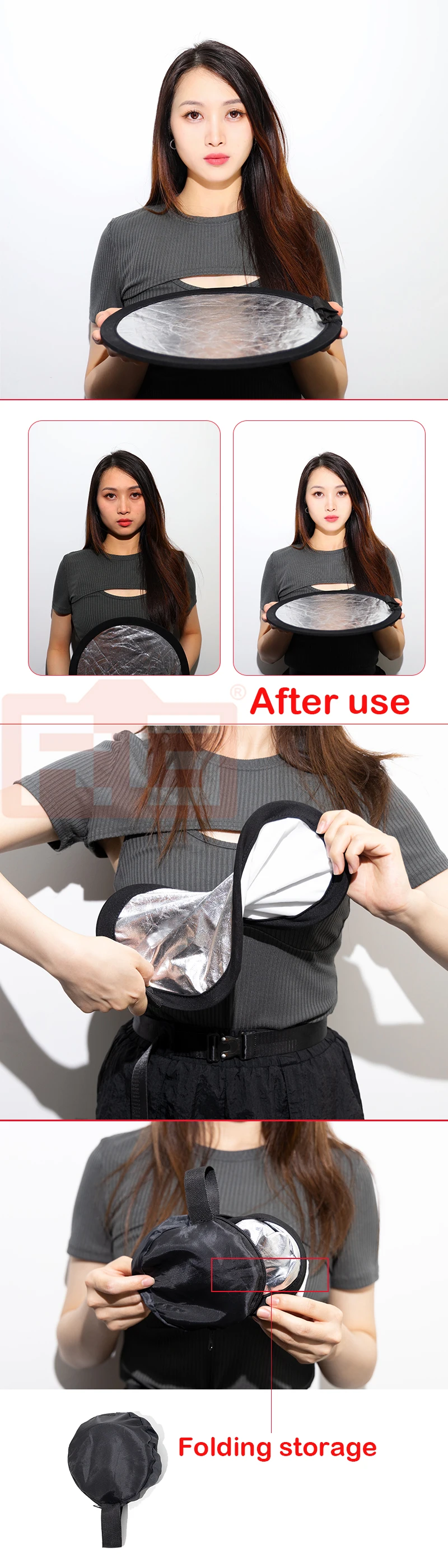 Особенности:5 в 1: золотой, серебряный, белый, черный и прозрачный.Отражатель с пятью различными отражающими поверхностями может использоваться для заполнения, отражения, рассеивания, поглощения или смягчения света.Прочная и Гибкая стальная рама, ее можно легко сложить в небольшой размер.Поставляется с чехлом для переноски на молнии для удобства переноски.