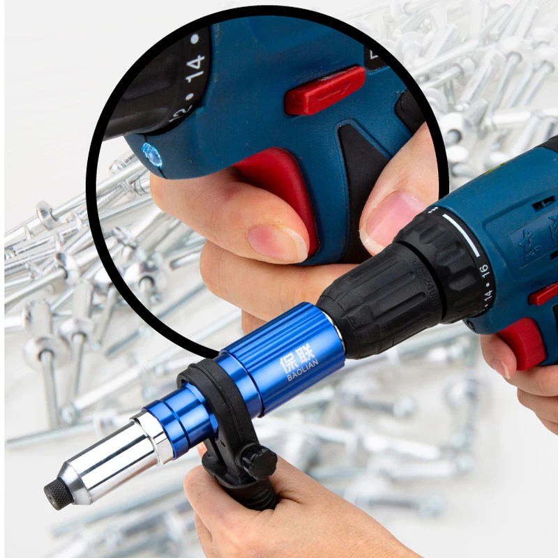 1. Отрегулируйте электродрель на соответствующую передачу2. Откройте патрон электродрели, вставьте адаптер и поверните зажим вперед3. Включите функцию разворота электродрели и вставьте заклепки соответствующих спецификаций, пока не услышите щелчок4. Снова включите функцию прямого вращения, чтобы выровнять отверстия и Вставить заклепки5. Снова включите функцию reverse и выйдите из заклепки