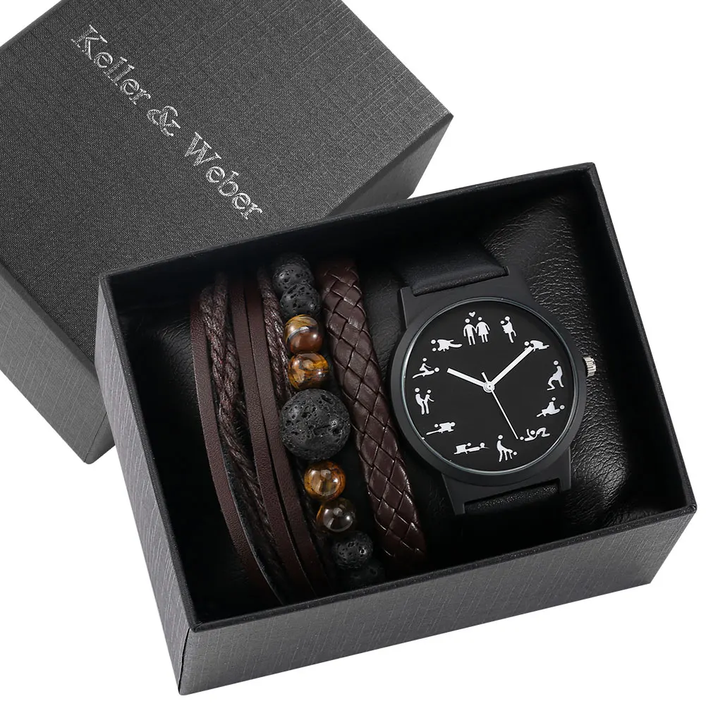 Мужские наручные часы подарочный набор простые черные кварцевые часы коричневый плетеный кожаный браслет с бусинами подарки для мужчин Муж парень папа