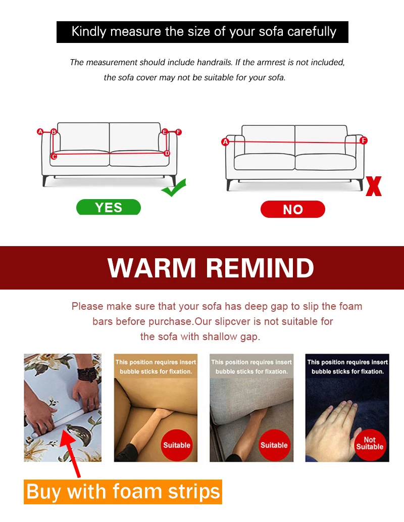 Посылка включает в себя: 1 чехол для дивана или 2 наволочки (не чехол для дивана)Примечание: В комплект входит только 1 чехол для дивана, не включая наволочку. (Цена указана только за 1 чехол для дивана, в комплект не входят наволочка или другие аксессуары, если вы хотите наволочку, вам необходимо разместить заказ отдельно.) L форма диван нужно купить 2 шт чехлы для дивана.Размер:Одноместный чехол для дивана: подходит для дивана размером 90-140 смЧехол для дивана с двойным сидением: подходит для дивана размером 145-185 смЧехол для дивана с тремя сиденьями: подходит для дивана размером 190-230 смЧехол для дивана на четыре сиденья: подходит для дивана размером 235-300 смПрименимый диван: безрукий диван, подлокотник диван, l-образный диван, секционный диванПожалуйста, измерьте свой диван с подлокотником, затем выберите размер, если вы не измерите его, крышка дивана будет меньше, чем ваш диван.Обратите внимание:1. Этот чехол для дивана подходит для дивана, который имеет зазор, между сидением со спинкой и подлокотником. (Пожалуйста, убедитесь, что ваш диван имеет глубокий зазор, чтобы выскользнуть пенопластовые стержни перед покупкой. Наш чехол для дивана не подходит для дивана с мелким зазором.)2. Пожалуйста, измерьте свой диван с подлокотником, затем выберите размер, если вы не измерите его, крышка дивана будет меньше, чем ваш диван.3. Допускается погрешность в 1-3 см при ручном измерении, разные страны имеют разный размер, пожалуйста, проверьте его перед покупкой.4. Из-за проблем с транспортировкой на большие расстояния, продукт будет немного складываться, он может быть не таким плоским, как на картинке, но доза не влияет на использование.5. Поскольку разница между различными мониторами, изображение может не отражать фактический цвет товара. Мы гарантируем, что рисунок такой же, как показано на фотографиях.