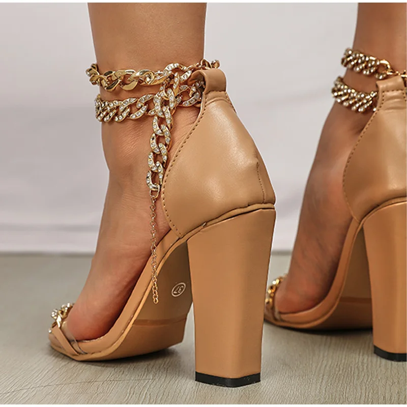 Сандалии женские на высоком каблуке, босоножки с цепочкой и кристаллами, открытый носок, ремешок с пряжкой, модная обувь, 2021