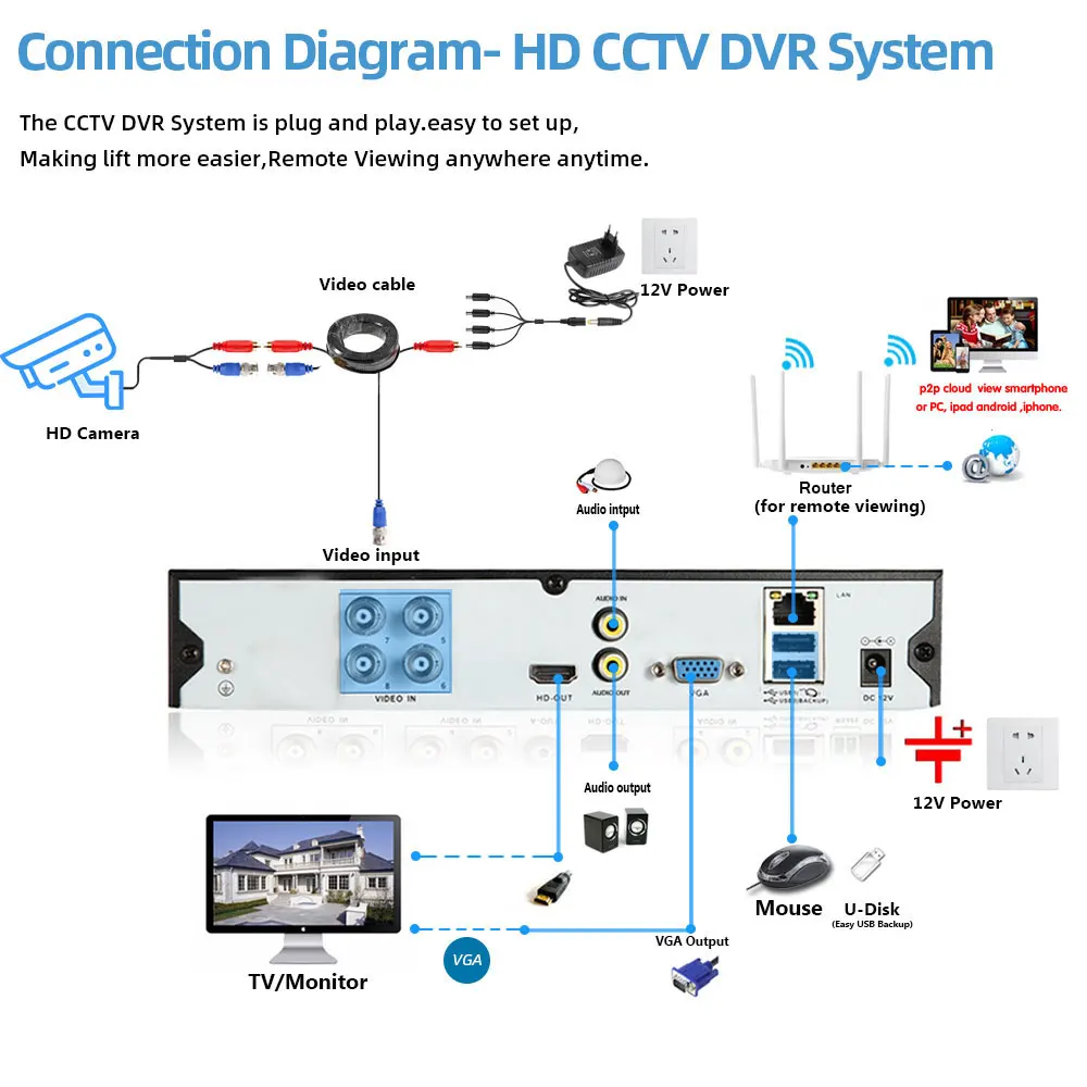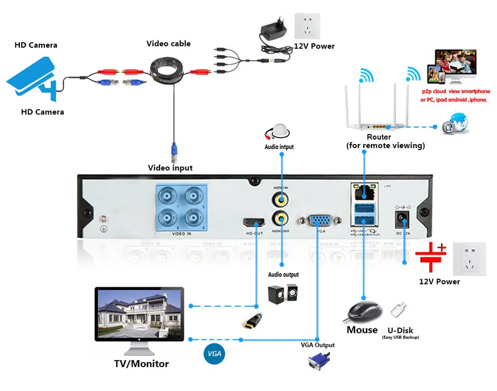 Простая настройка, всего 4 шага для просмотра мобильный телефон, просмотра видео в режиме реального времени из любого места и в любое время с помощью смартфона, стола или ПК с передовой технологией P2P, вы можете получить удаленный доступ к вашей системе за считанные минуты или меньше, нет необходимости в переадресации, удаленный доступ никогда не был таким простым!