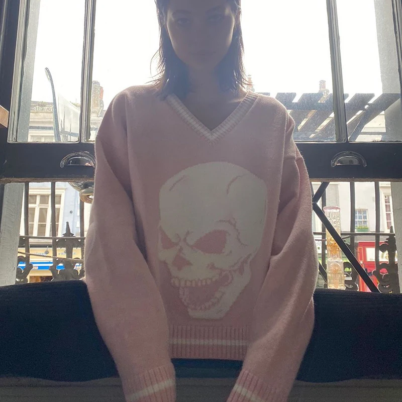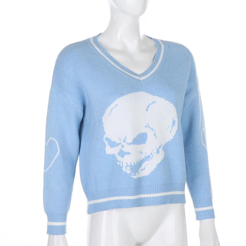 Свитер женский вязаный, с принтом черепа, с V-образным вырезом, осе...