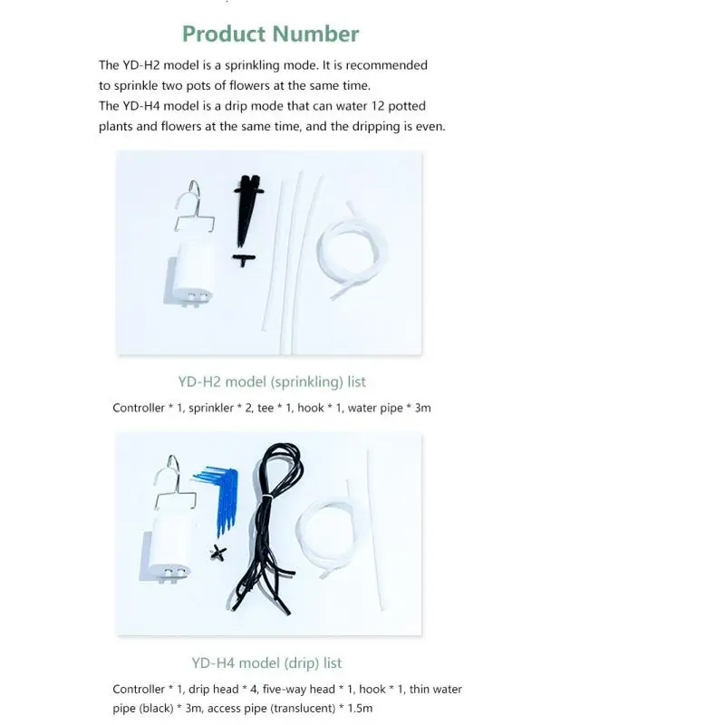 Контроллер * 1, капельная головка * 4, пятиходовая головка * 1, крючок * 1, тонкая водопроводная труба (черная) * 3 м, труба доступа (прозрачная) * 1,5 м