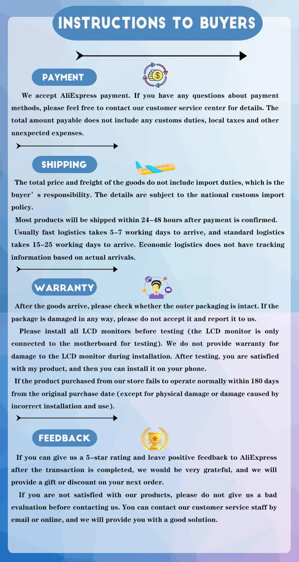 1: каждый заказ предоставляет только один набор инструментов для разборки, такое же количество протекторов для ЖК-экрана из закаленного стекла.2: после получения, он был поврежден, пожалуйста, сделайте снимок и свяжитесь с нами вовремя, чтобы мы могли изменить его для вас.3: гарантия после продажи: 6 месяцев (ущерб, причиненный человеком, не может быть получен после продажи).4: функциональная проверка не повреждена перед поставкой, и заказ будет доставлен в течение 2 рабочих дней.5: отличное послепродажное обслуживание: мы можем удовлетворить вас до тех пор, пока вам это нужно.6: непрофессионалы рекомендуют покупать ЖК-экраны с границами для удобной замены.