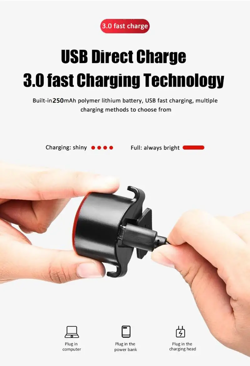 USB Перезаряжаемый велосипедный задний фонарь и автоматическое отключение при полной зарядке.