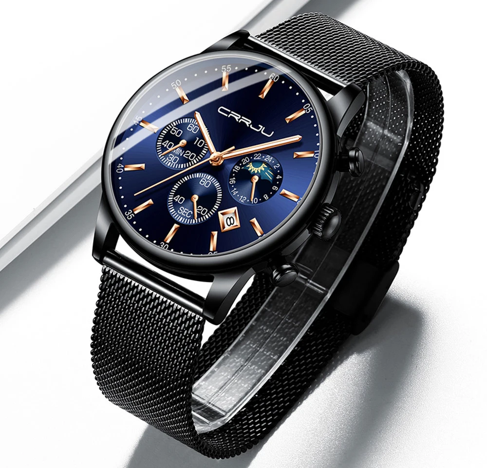 Часы мужские CRRJU, с синим циферблатом, с сетчатым ремешком