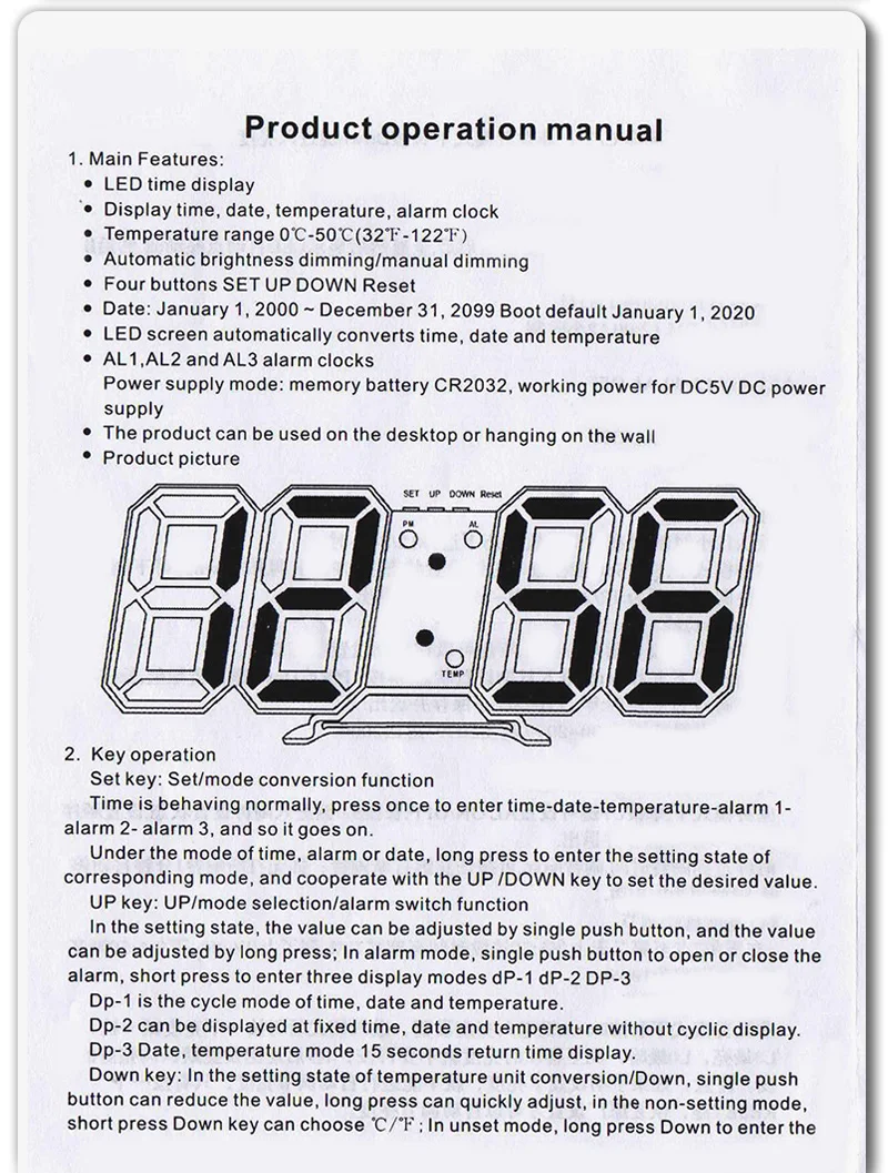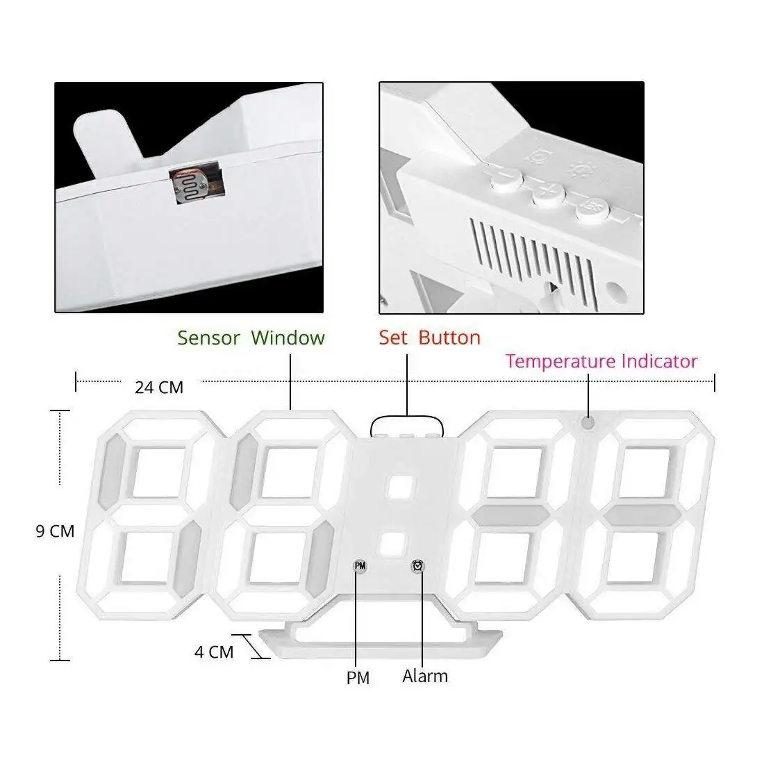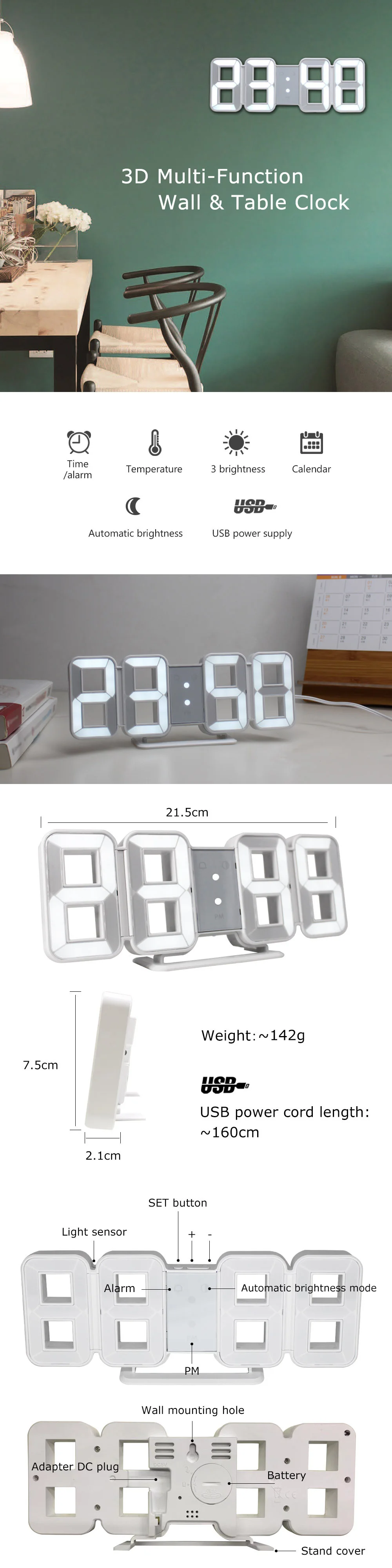 Продукт: 3D цифровой светодиодный часыПитание: DC 5V1A (адаптер не входит в комплект, USB кабель в комплекте)Материал: АБС-пластикФункция:1. Время2. Сигнализация (AL)3. Таймер4. ТемператураПосылка: пузырчатая сумка + оригинальная коробка