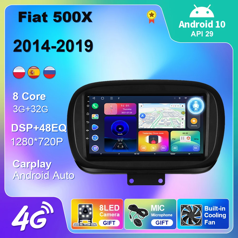 Автомагнитола для Fiat 500X 500X2014-2019, 4G, Wi-Fi, мультимедийный проигрыватель на Android, 2 din, без DVD
