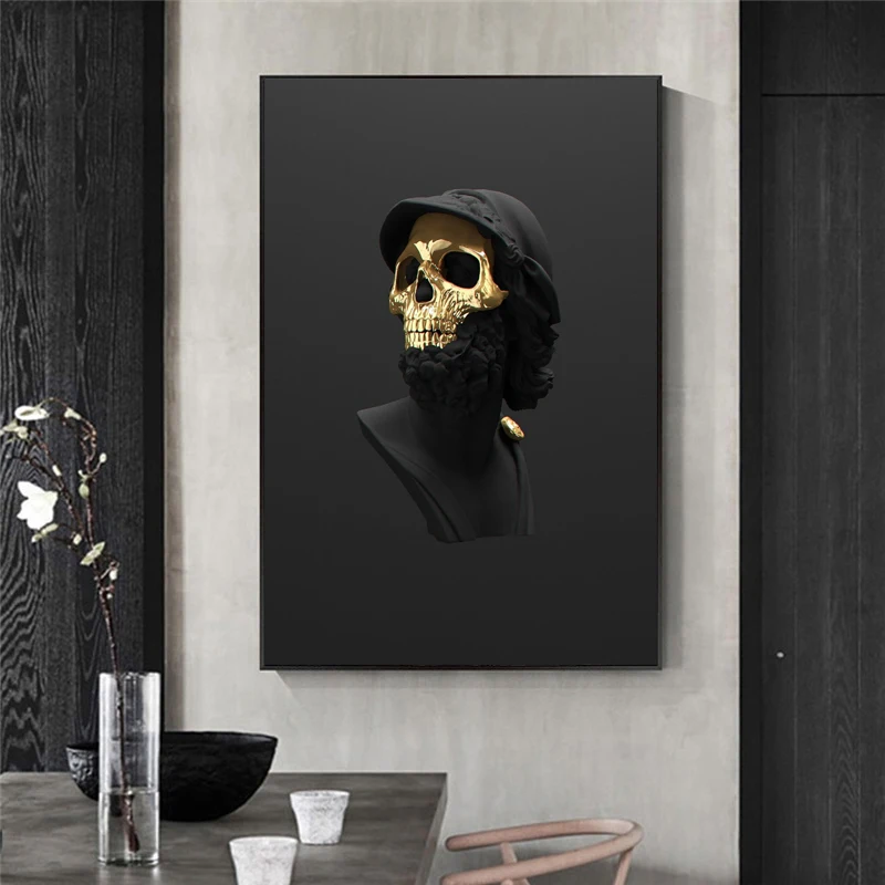 Статуя с головой золотого черепа, домашний декор, холст, абстрактные картины, плакаты и принты, Современное украшение для дома, гостиной, спальни