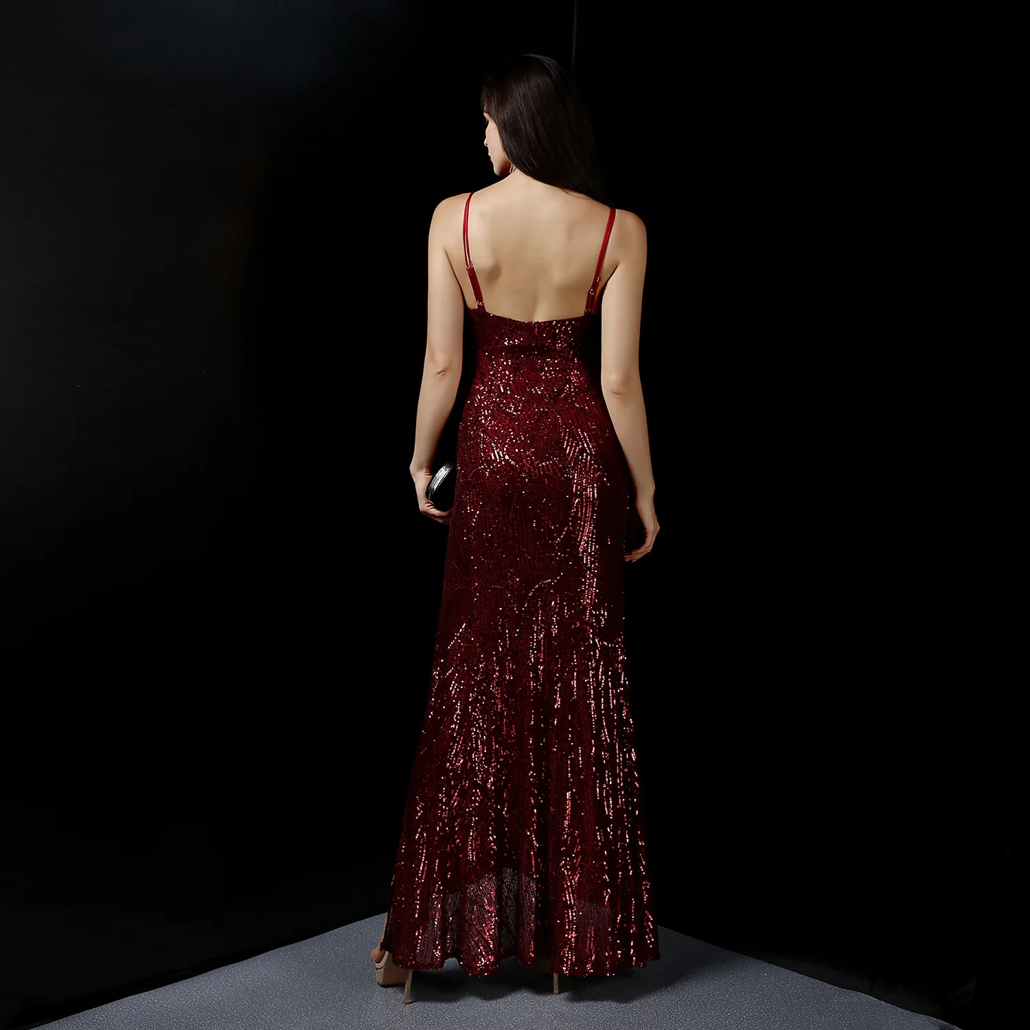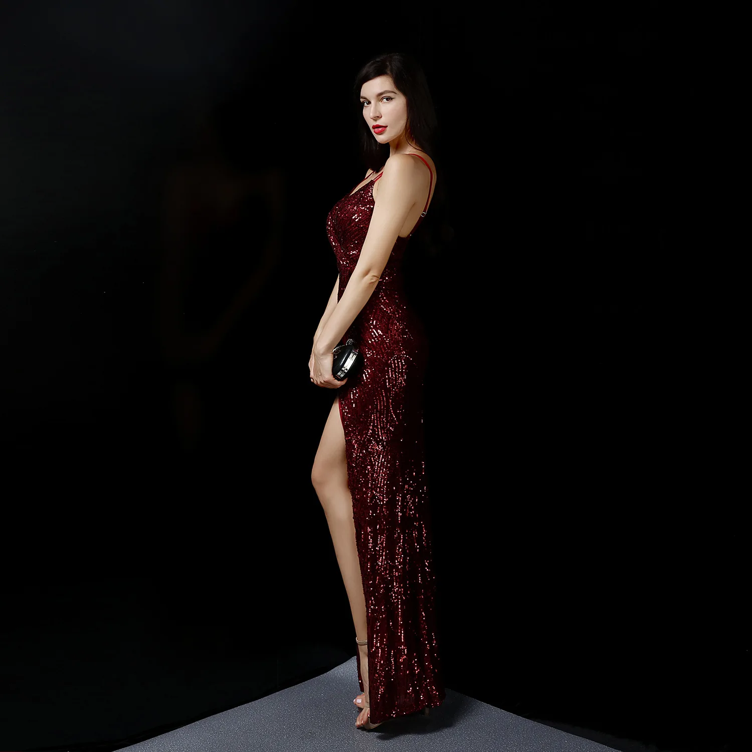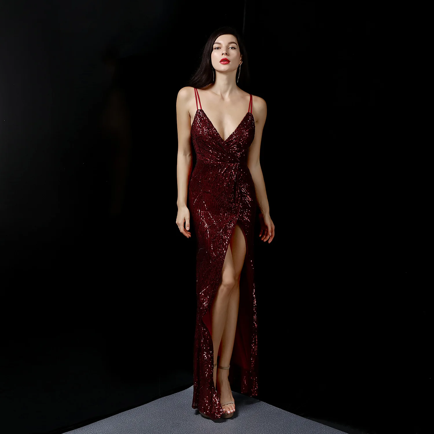 Модные сексуальные красные блестящие Длинные вечерние платья на бретельках, коктейльные платья с глубоким V-образным вырезом, высоким разрезом и открытой спиной, платья для выпускного вечера